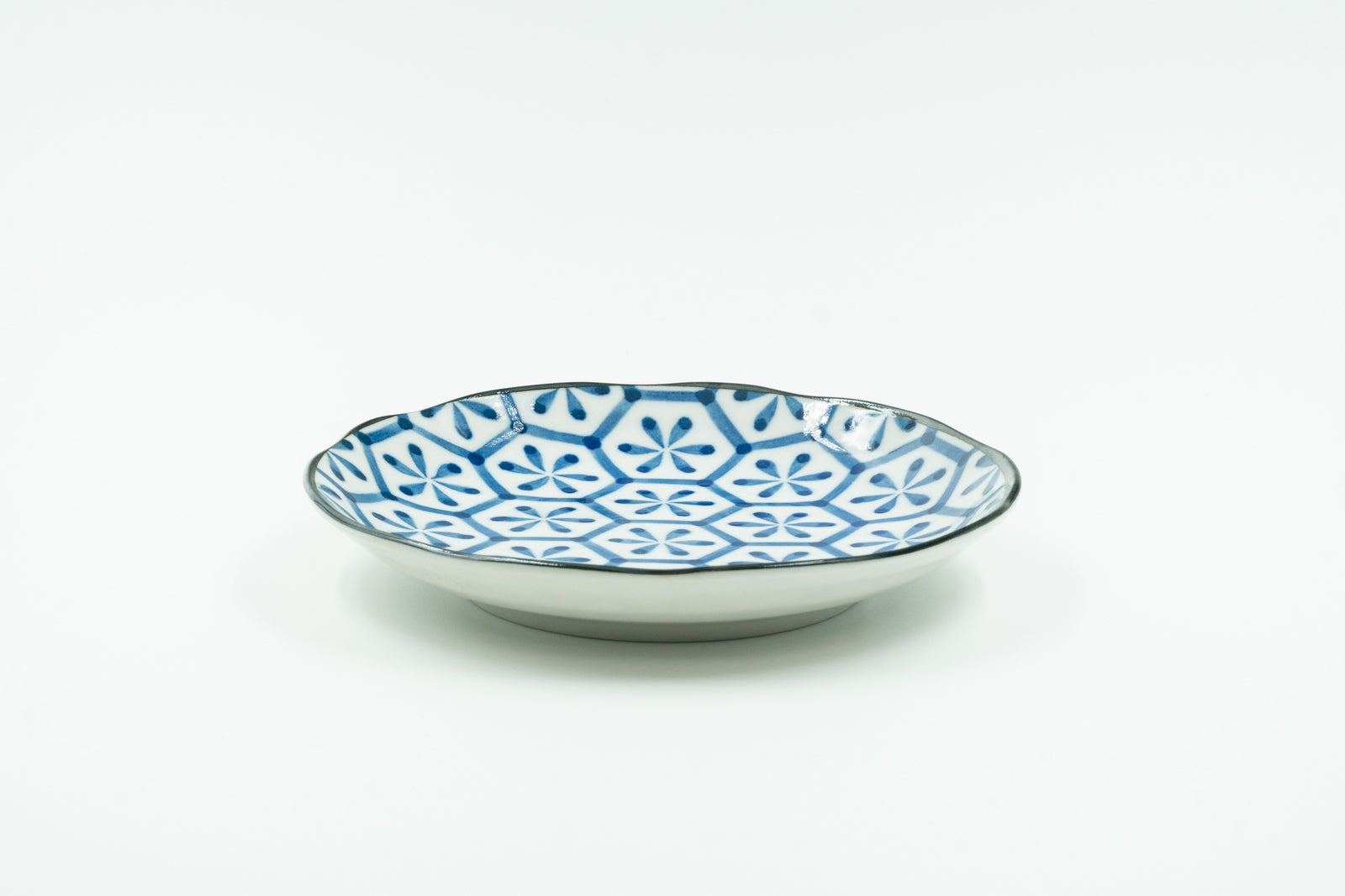 Round Plate 6.5" x 1.25" h White/Blue w/ Petal Pattern. Made in Japan.