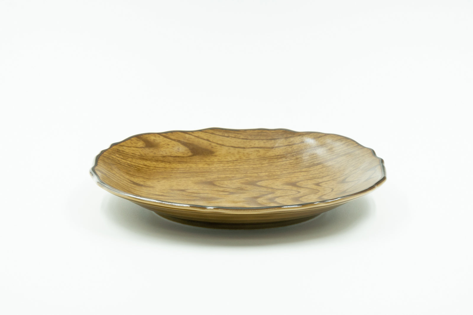 Round Plate 8" sq Brown Wood Grain Pattern Glossy. Made in Japan.